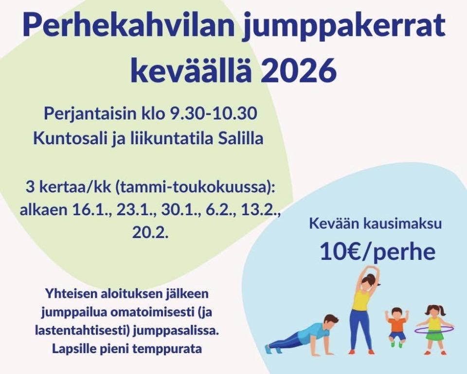 Perhekahvila kokoontuu kevään 2026 ajan yhteisten jumppahetkien merkeissä Kuntosali ja liikuntatila Salin jumppasalissa. Jumppahetki on perjantaisin klo 9.30-10.30 (n. 3x kuukaudessa). Yhteisen aloituksen jälkeen jokainen voi jumpata omatoimisesti. Lapsille pieni temppurata. Kausimaksu koko keväältä 10€/perhe. Lisätiedot Jenni-Kaisalta (0407458452).